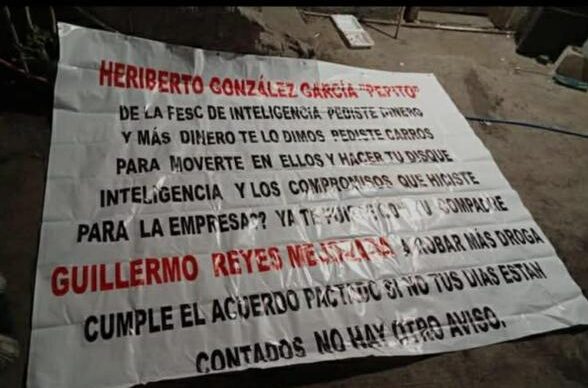 El hallazgo ocurrió a las 06:42 horas, cuando una unidad de la Policía Municipal que realizaba un recorrido preventivo observó la lona con una leyenda escrita en rojo y negro. El mensaje acusaba a un agente de inteligencia de la FESC, identificado con el alias «Pepito», de presuntas extorsiones, pactos incumplidos y robo de droga.