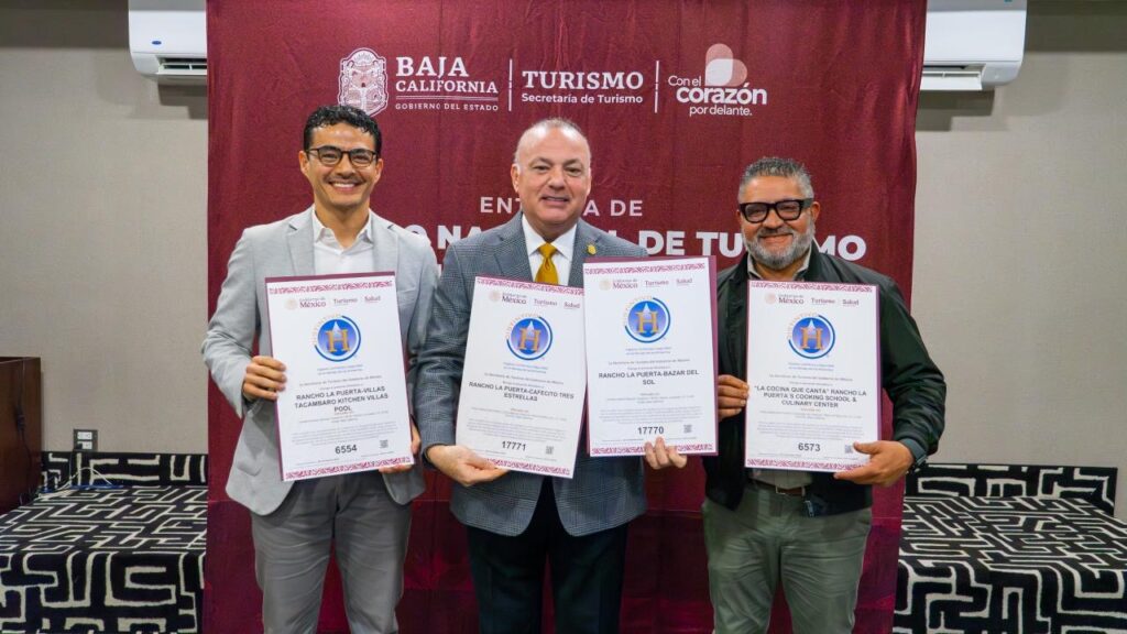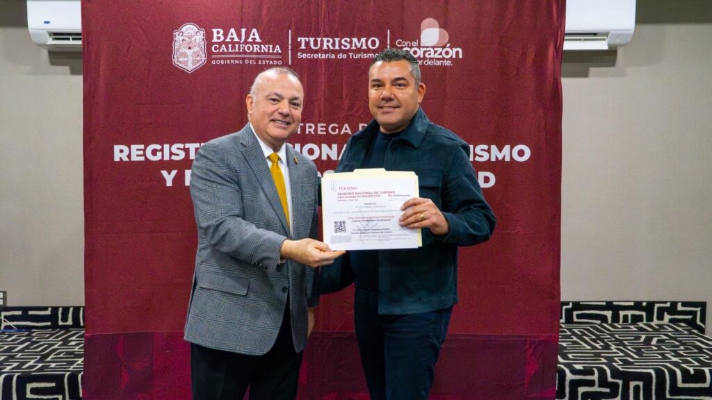 Con el propósito de fortalecer la profesionalización y competitividad del sector, el secretario de Turismo de Baja California, Miguel Ángel Badiola Montaño, realizó la entrega de 14 Registros Nacionales de Turismo, 4 Distintivos H y 1 Constancia de Clasificación Hotelera a prestadores de servicios turísticos de la entidad.