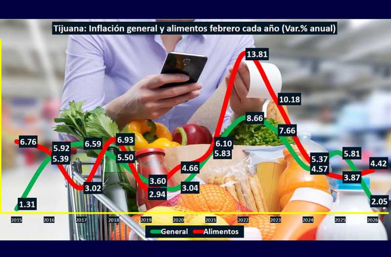 A pesar de que la inflación general en la ciudad muestra una tendencia de desaceleración técnica, el bolsillo de las familias fronterizas sigue bajo asedio. De acuerdo con el más reciente informe del Instituto Nacional de Estadística y Geografía (INEGI), la inflación en Tijuana cerró febrero de 2026 con una tasa anualizada del 2.05%. Si bien esta cifra es significativamente menor al 5.81% registrado en el mismo mes de 2025, el rubro de los alimentos se mantiene como el principal verdugo del poder adquisitivo.