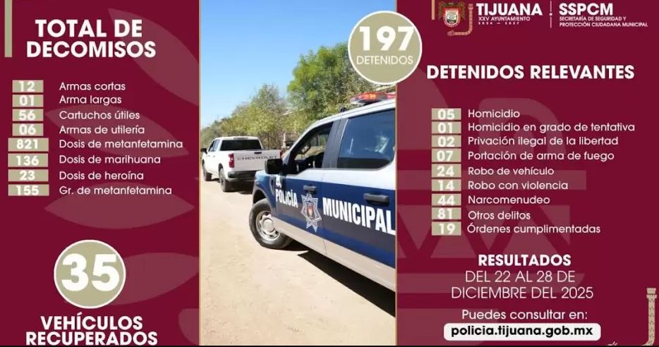En un esfuerzo por reducir los índices delictivos durante el cierre de año, la Secretaría de Seguridad y Protección Ciudadana Municipal (SSPCM) de Tijuana informó que, mediante el reforzamiento de patrullajes y acciones preventivas, se logró el aseguramiento de más de 190 personas vinculadas a diversos delitos y faltas administrativas.