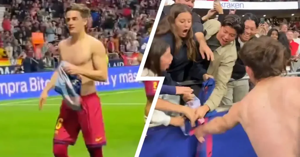 Al finalizar el partido, Gavi se acercó a la grada donde se encontraba la aficionada. En medio de la emoción y los aplausos del público, el futbolista le entregó su camiseta, generando un momento único que fue captado por varios asistentes y compartido ampliamente en redes sociales.